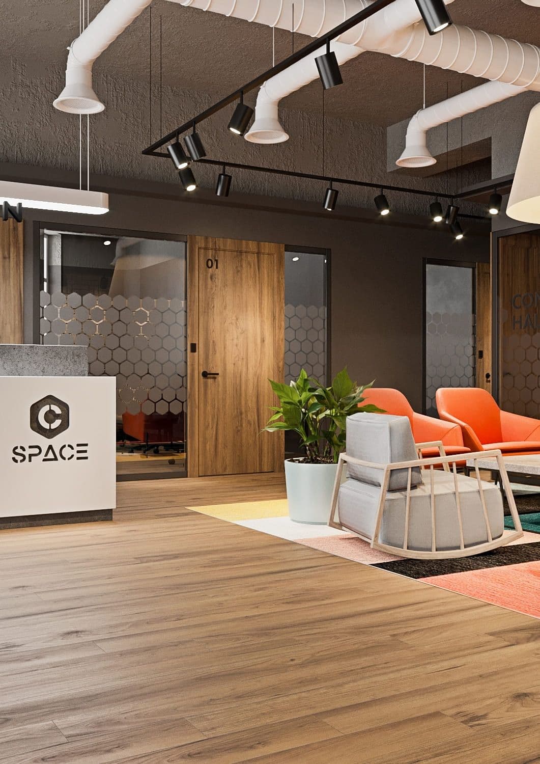 При проектировании этого коворкинга команда уделила особое внимание созданию гостеприимной атмосферы сотрудничества. В пространстве есть общие зоны открытой планировки, предназначенные для стимулирования взаимодействия между людьми из разных отраслей и секторов, что позволяет предпринимателям легко общаться, обмениваться идеями и налаживать связи. Также устроено несколько тематических зон: тихая зона для чтения и сосредоточенной работы и удобная релаксационная комната. Имеются 2 скайп комнаты для проведения конфиденциальных звонков и избавления посторонних шумов. Кухонная зона оснащена всей необходимой бытовой техникой, что дарит резидентам ощущения уютной атмосферы, комфорта, тепла. А для еще большего удобства в коворкинге имеется душевая комната с целью сократить время резидентов перед важными встречами или иными событиями, которые требуют быть в форме и хорошем расположении духа здесь и сейчас.